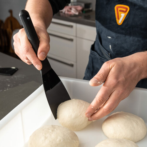 Dieser Teigspachtel ist ein unverzichtbares Hilfsmittel, wenn es um die Arbeit mit Pizza-Teiglingen geht. Da der Spachtel flexibel ist, passt er sich dem Boden deiner Pizzaballen-Box an, sodass du spielend leicht unter die einzelnen Teigkugeln gelangst. So kannst du die Teiglinge viel bequemer anheben und entnehmen.