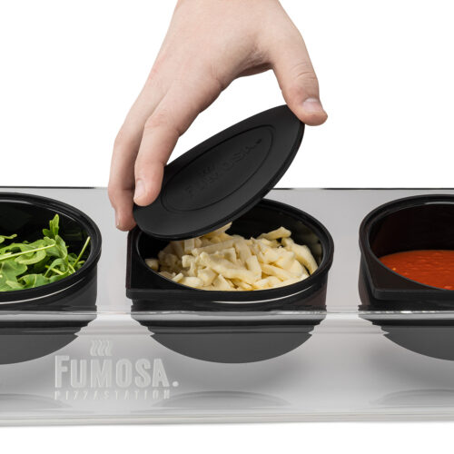 Neben der Stückgare kannst du deine POMPEY Behälter ebenso für das Aufbewahren von Pizzazutaten nutzen: Bestücke sie z.B. mit Pizzasauce, Fior di Latte, frischem Basilikum oder ital. Salami, wobei du die Zutaten in den edlen schwarzen Behältern optimal in Szene setzen kannst, wenn dir deine Gäste über die Schulter schauen.